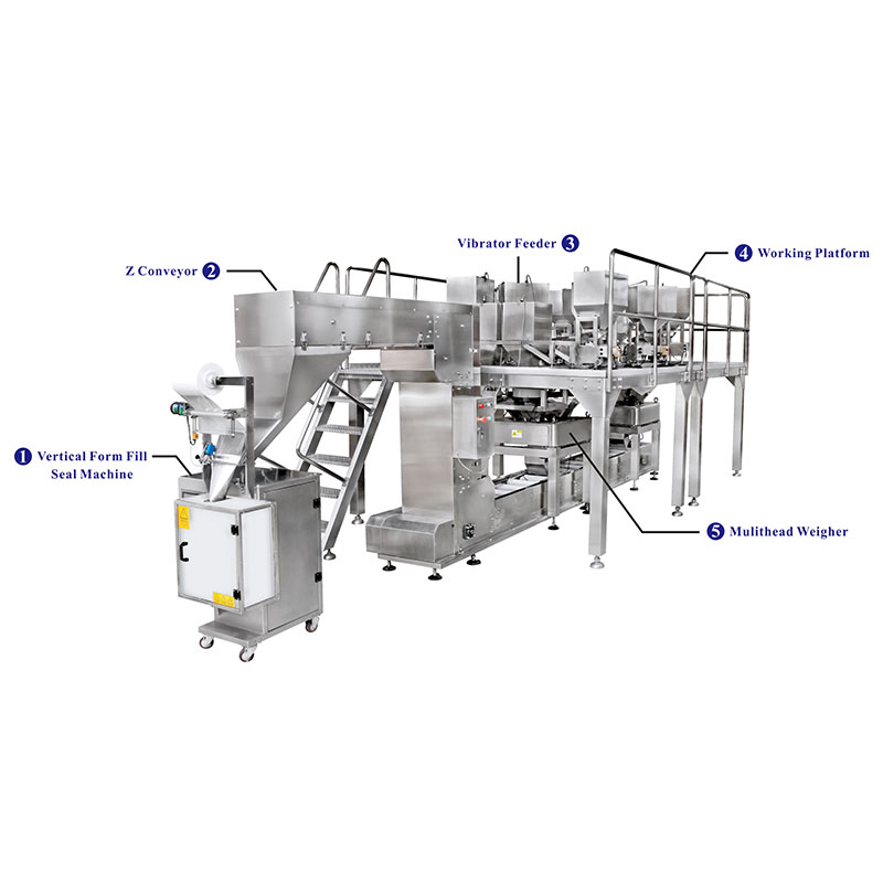 System including: Vibrator feeder, Z bucket conveyor, Working platform, Multihead weigher, Verticl form fill seal machine, Finished products conveyor, Dropper metal detector.