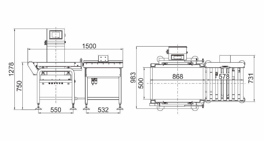 Large plage de pesée, convoyeur à bande et à rouleaux.